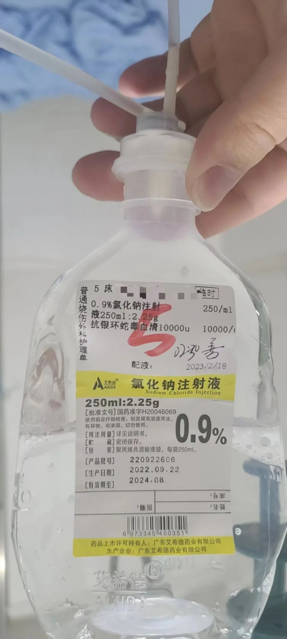 “大夫可能一启动就判断咬我的大致率是银环蛇,是以主要给我扎银环蛇血清。第一支血清扎到一半,照顾跑进来说‘银环蛇毒阳性’,其时扎了16支血清。”