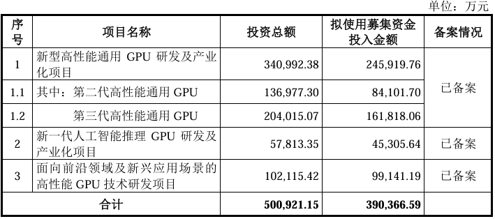 这次IPO,沐曦股份拟召募资金39.04亿元,用于新式高性能通用GPU研发及产业化技俩、新一代东说念主工智能推理GPU研发及产业化技俩、面上前沿鸿沟及新兴期骗场景的高性能GPU时间研发技俩。